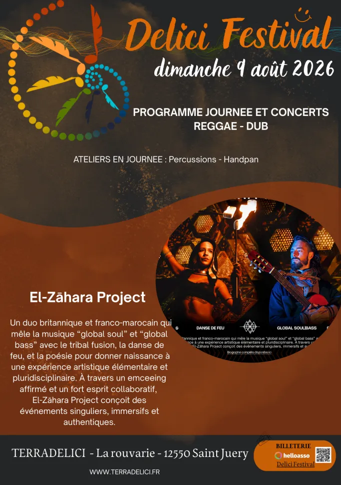 Un duo britannique et franco-marocain qui mêle la musique « global soul » et « global bass » avec le tribal diffusion, la danse de feu, et la poésie pour donner naissance à une expérience artistique élémentaire et pluridisciplinaire.A travers un emceeing affirmé et un fort esprit collaboratif, El Zahara Project conçoit des évènements singuliers, immersifs et authentiques.